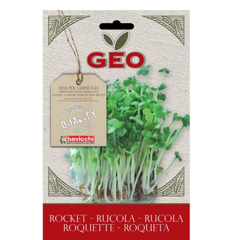 GEO GREENS økologiske rucolafrø til spiring giver de lækreste spirer, der smager som du kender smagen fra den krydrede rucolasalat.